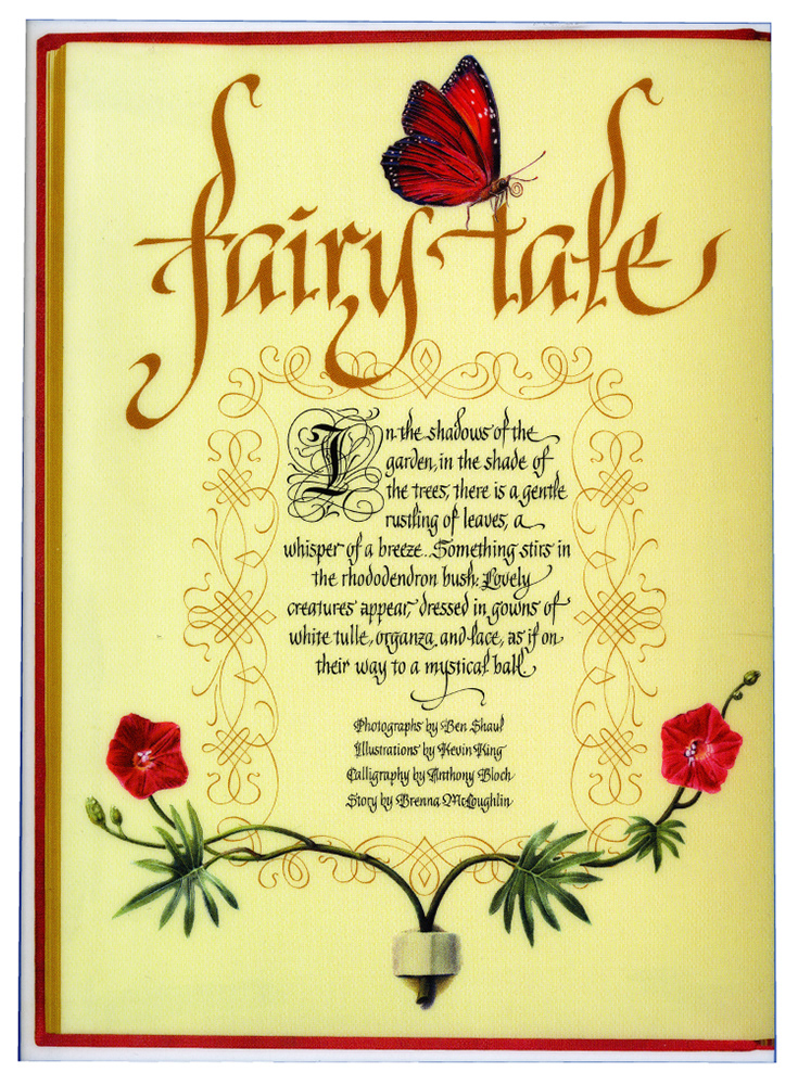 This traditional calligraphy page I designed was for a special themed article in Fairchild's Elegant Bride Magazine, created to feature 'timeless' ladies' gowns in the style of Medieval or Renaissance forest scenes, as if part of a magical story-book fairy tale. See below for more images. 2005. Art direction: Albert Toy.